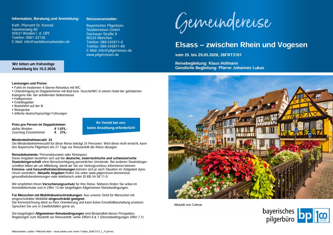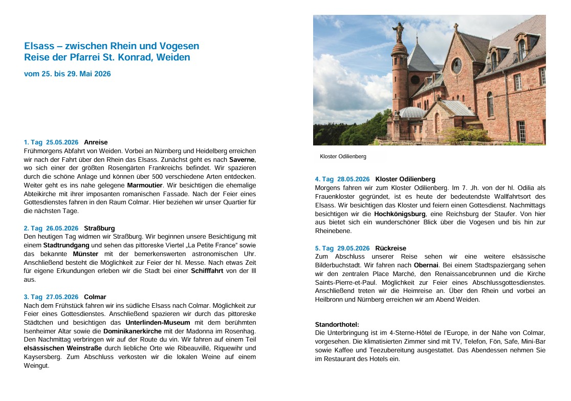 Wir laden Sie herzlich zu unserer Pfarrfahrt 2026 ins Elsass ein. Alle Informationen und Details finden Sie in den beiden Bildern (zum Vergrößern einfach anklicken). Die Anmeldekarte und die AGBs finden Sie im Linkbutton darunter.