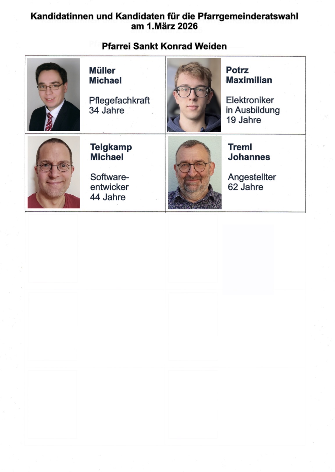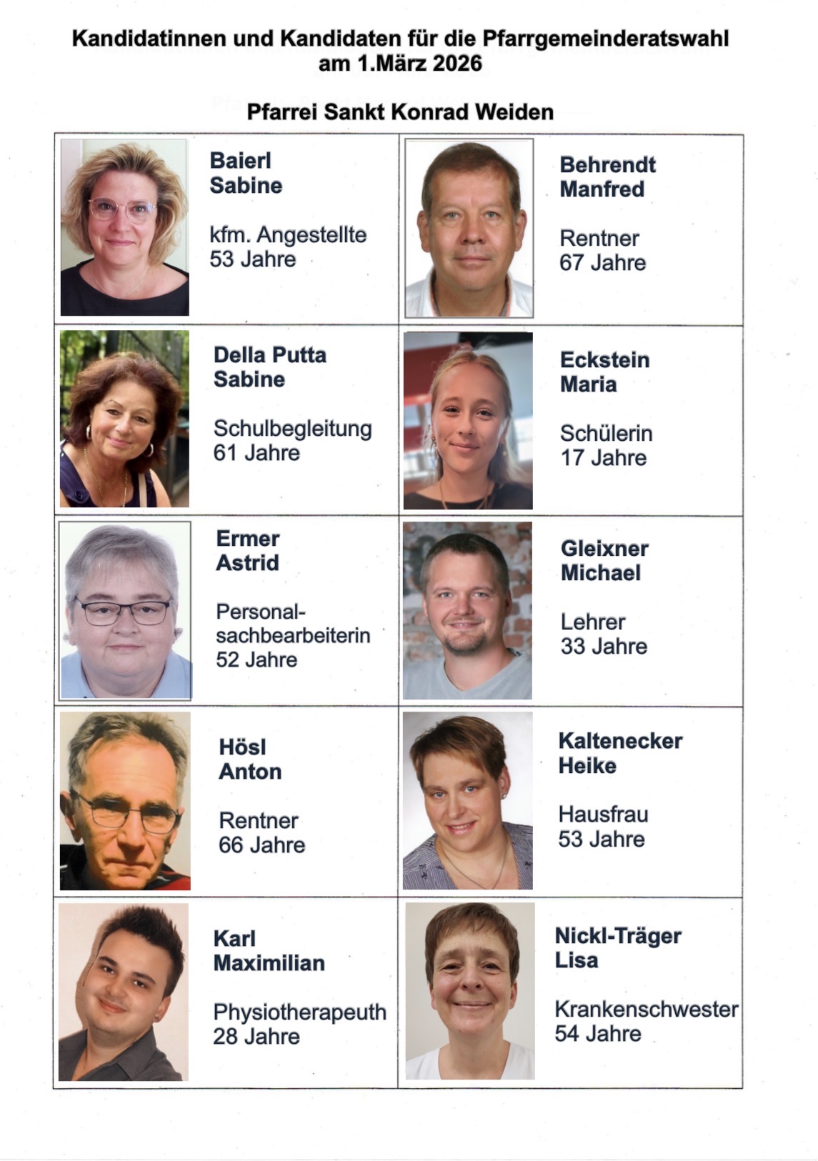 14 engagierte Kandidatinnen und Kandidaten stellen sich zur Wahl – eine bunte Mischung aus unserer lebendigen Pfarrei. Menschen mit unterschiedlichen Altersgruppen, Erfahrungen, Ideen und Talenten, die eines verbindet: der Wunsch, das Leben in unserer Pfarrei aktiv mitzugestalten und Verantwortung zu übernehmen.